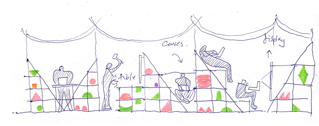 Soundground is an individual, student project aiming to create a "safe and sound" ground for exploring both loud and soft play activities for children. It is a play-space in nature, but not necessarily with nature, created especially for children who are not yet used to the unknown depths of grass, playing with bugs and "asphalt-free" zones. As a transit space, from a city environment to a wilderness of nature, it is for children that want to explore different scales and dynamics of play: from soft, quiet play to loud play. The green- soft side- of the wall contains shelves, sandpit, hanging plant-pots and hiding space, while the red -loud side- contains metal pots, plastic tubes and other up-cycled instruments for a musical play.